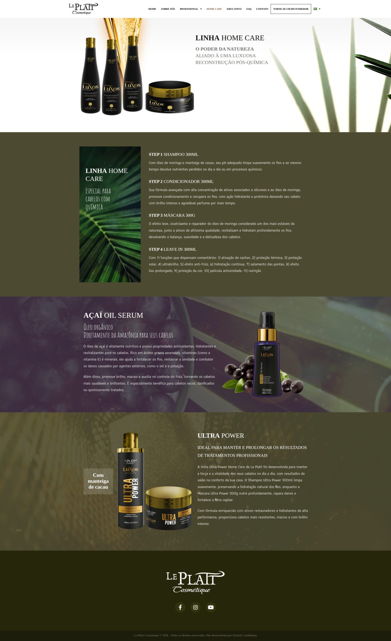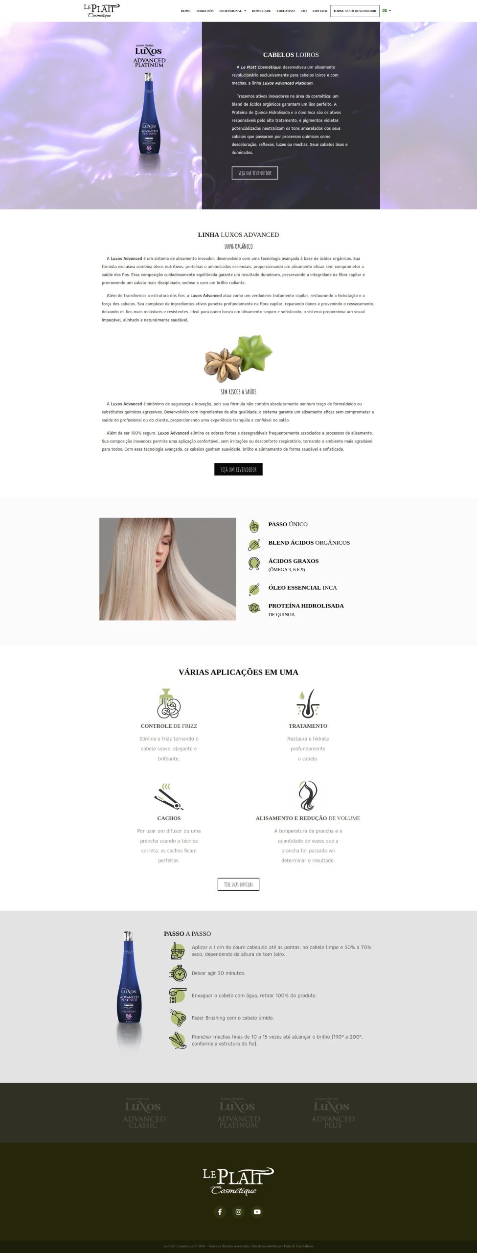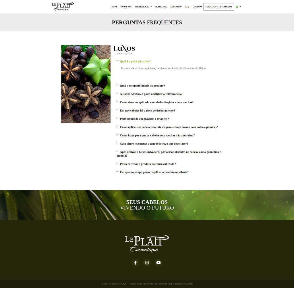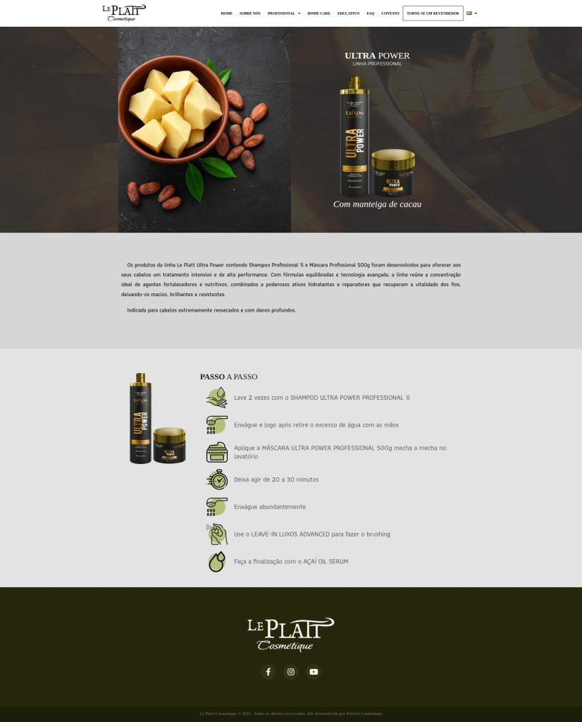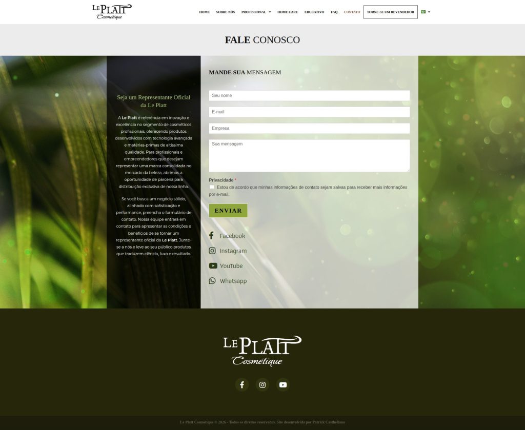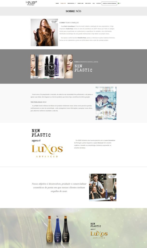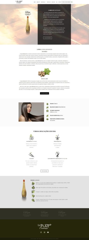 Site institucional desenvolvido para a marca de produtos de beleza Le Platt Cosmétique, com foco em apresentação de marca, organização de portfólio de produtos e comunicação direta com o público.