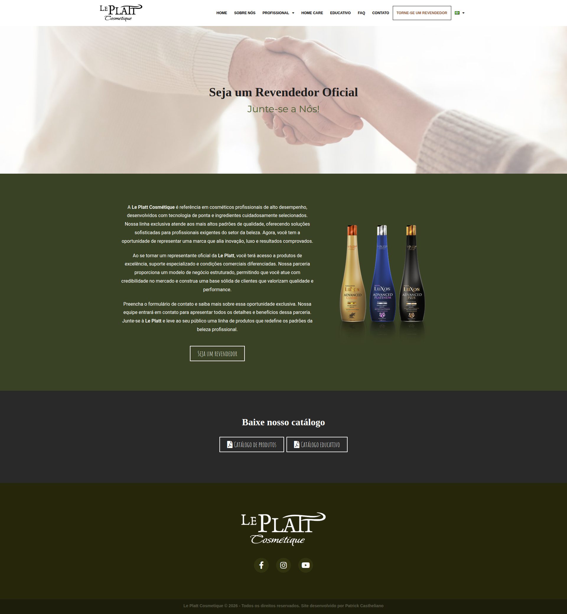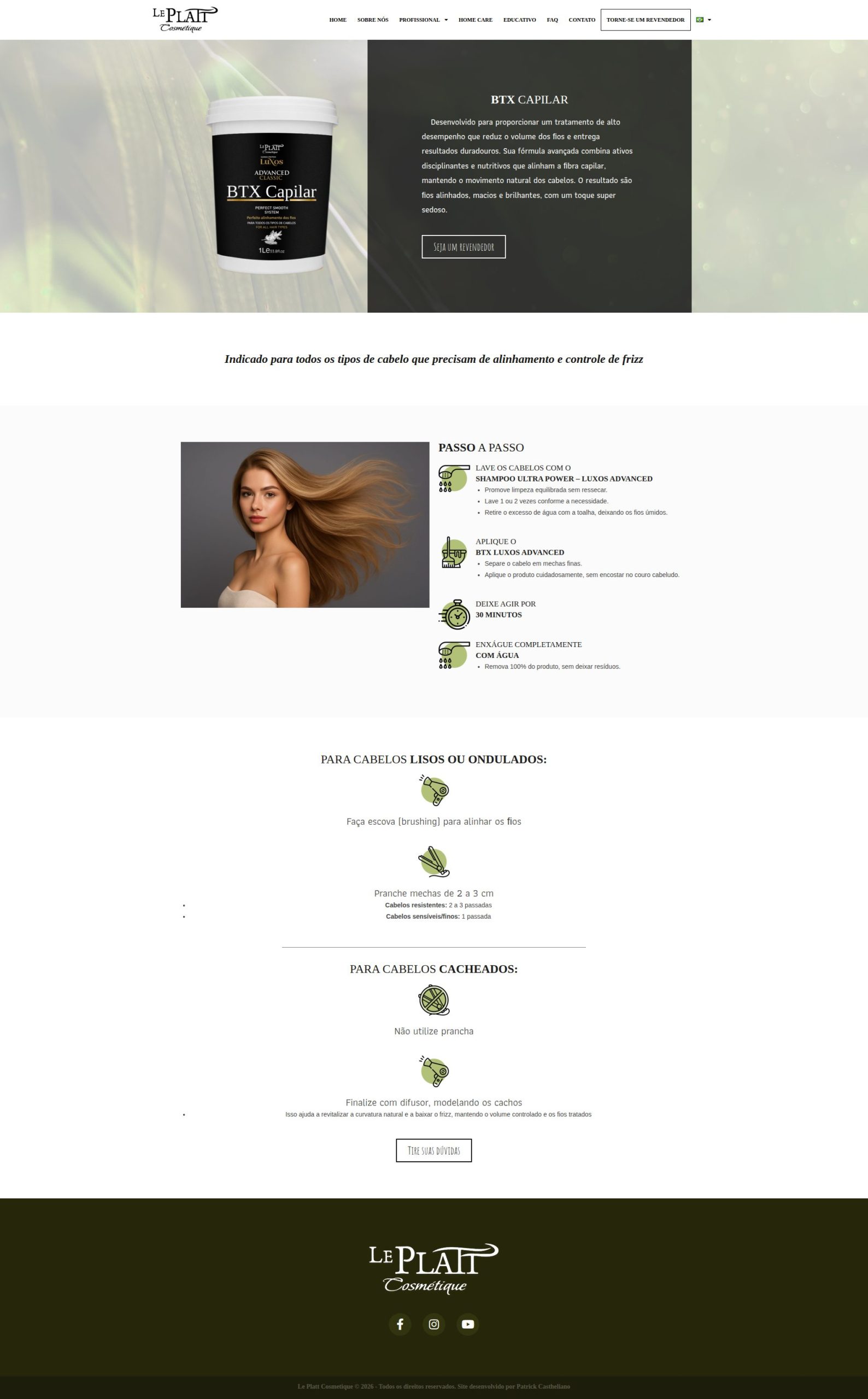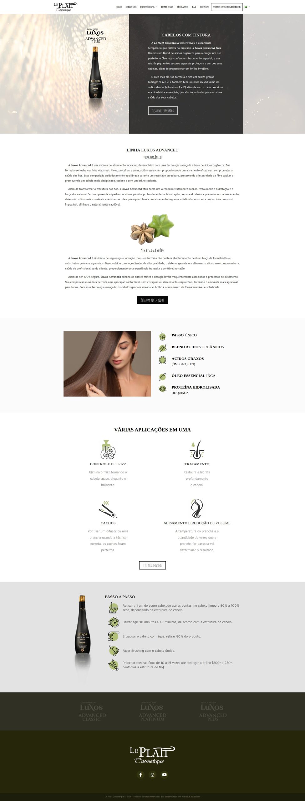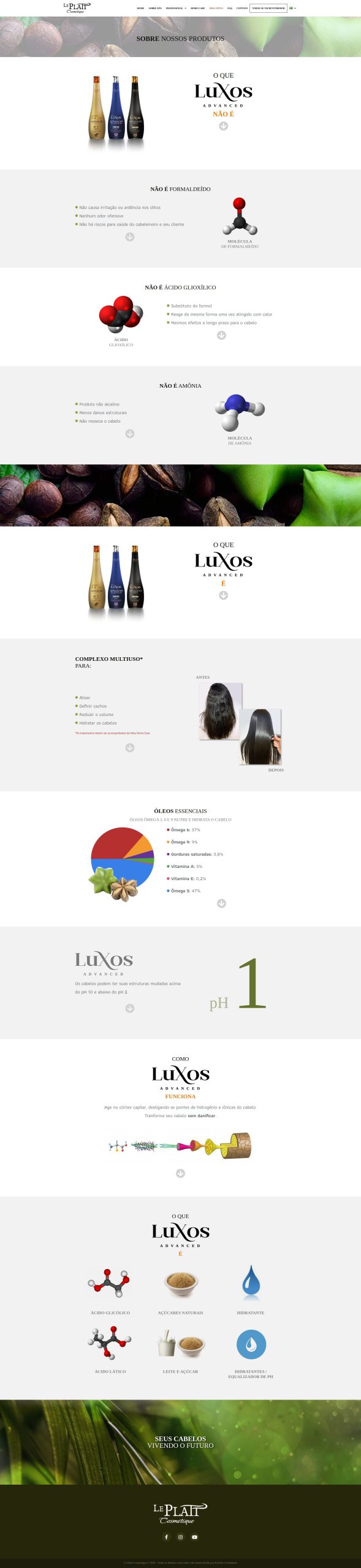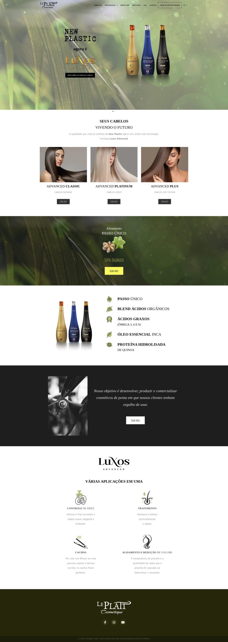 Site institucional desenvolvido para a marca de produtos de beleza Le Platt Cosmétique, com foco em apresentação de marca, organização de portfólio de produtos e comunicação direta com o público.